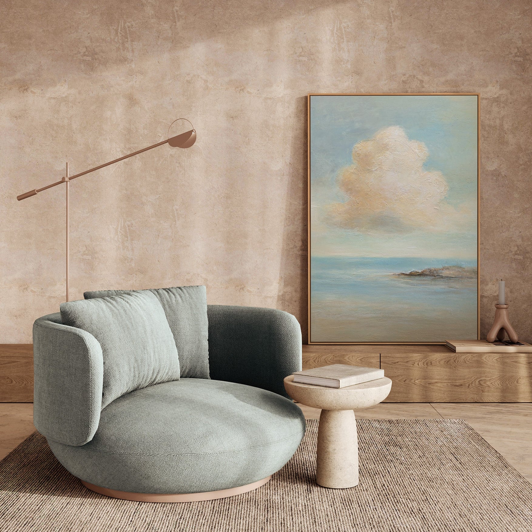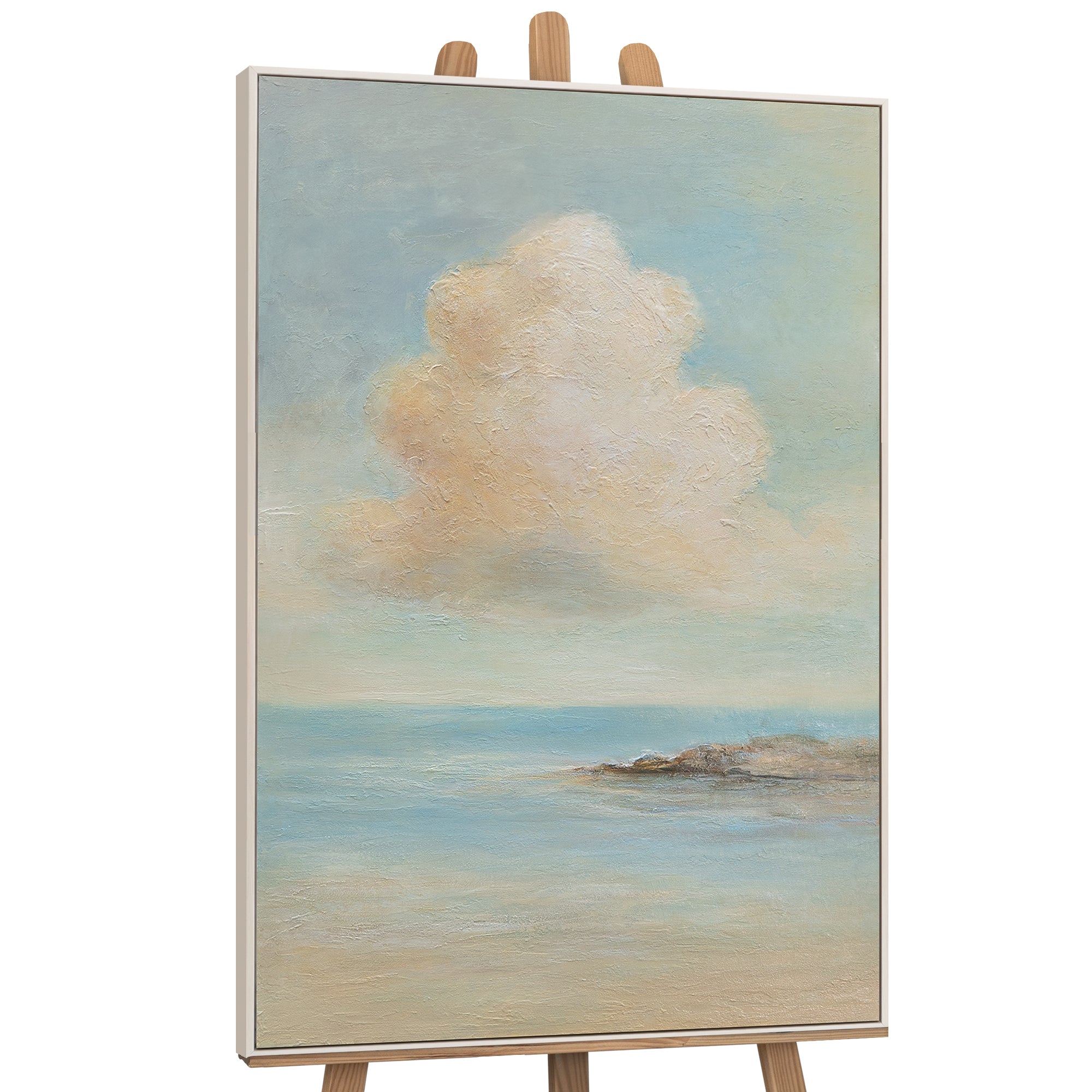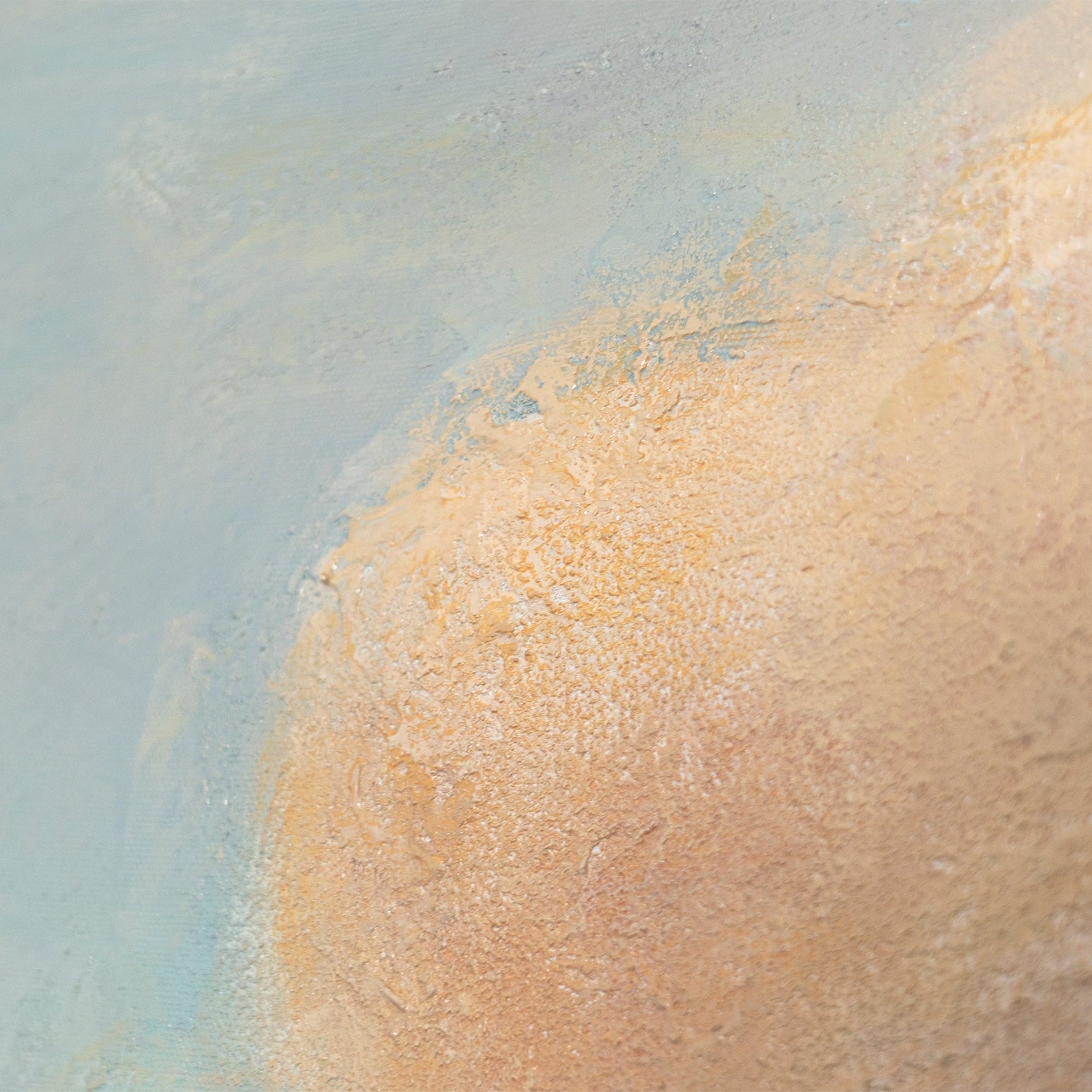 “Lightness of Being” is a painting about the tranquility that arises in the silence of the sea. Soft blue and sandy shades merge into the boundless horizon, where a lone cloud floats above the calm water. The texture of the brushstrokes adds depth, creating a sense of the lively movement of light and air.