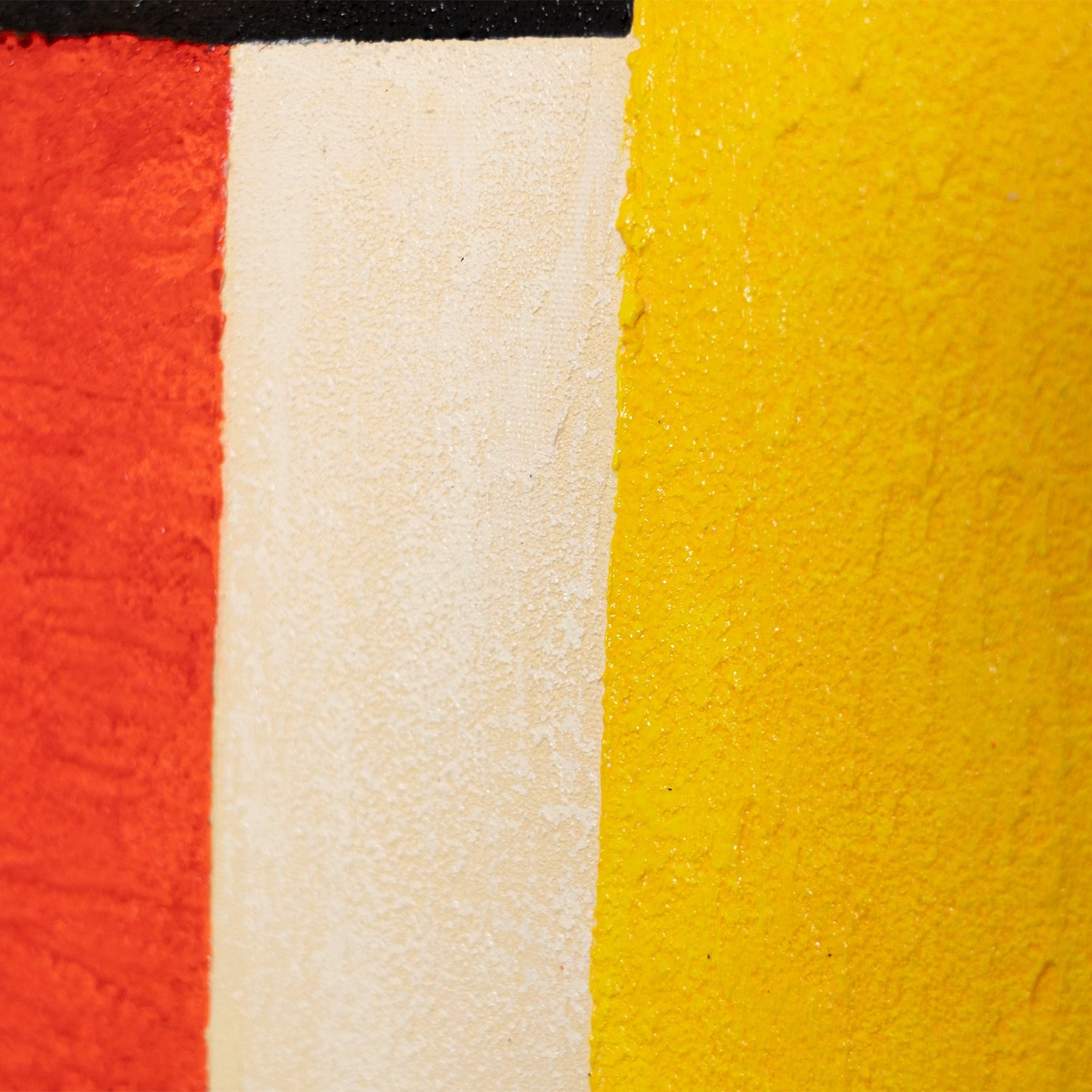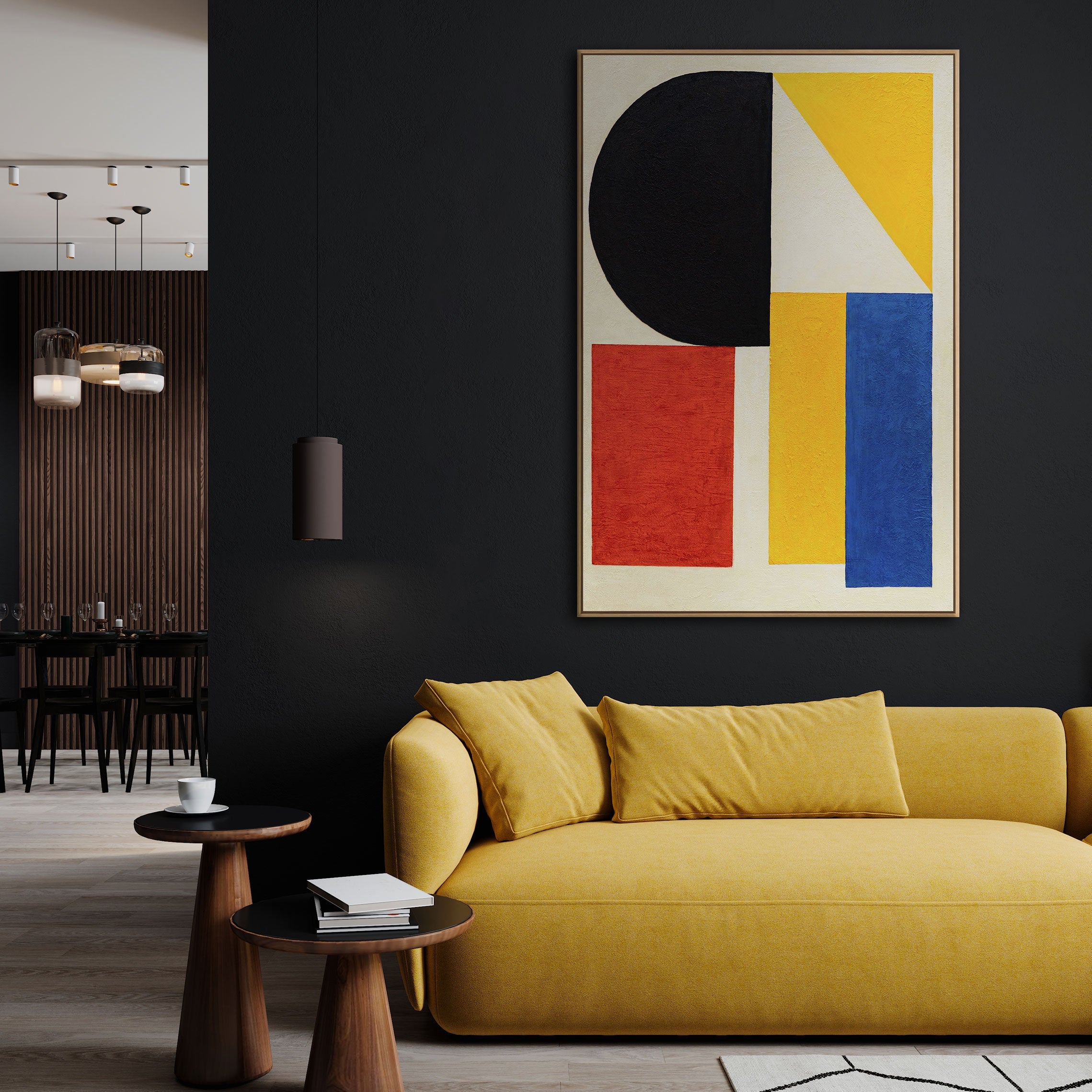 Contrasts is a dynamic interplay of colors and shapes, where each element has its own power. A deep black semicircle balances the saturated planes of red, blue, and yellow, creating a rhythm that simultaneously seduces the eye and disciplines the space. The painting conveys the energy of movement and inner balance inherent in simple forms.
