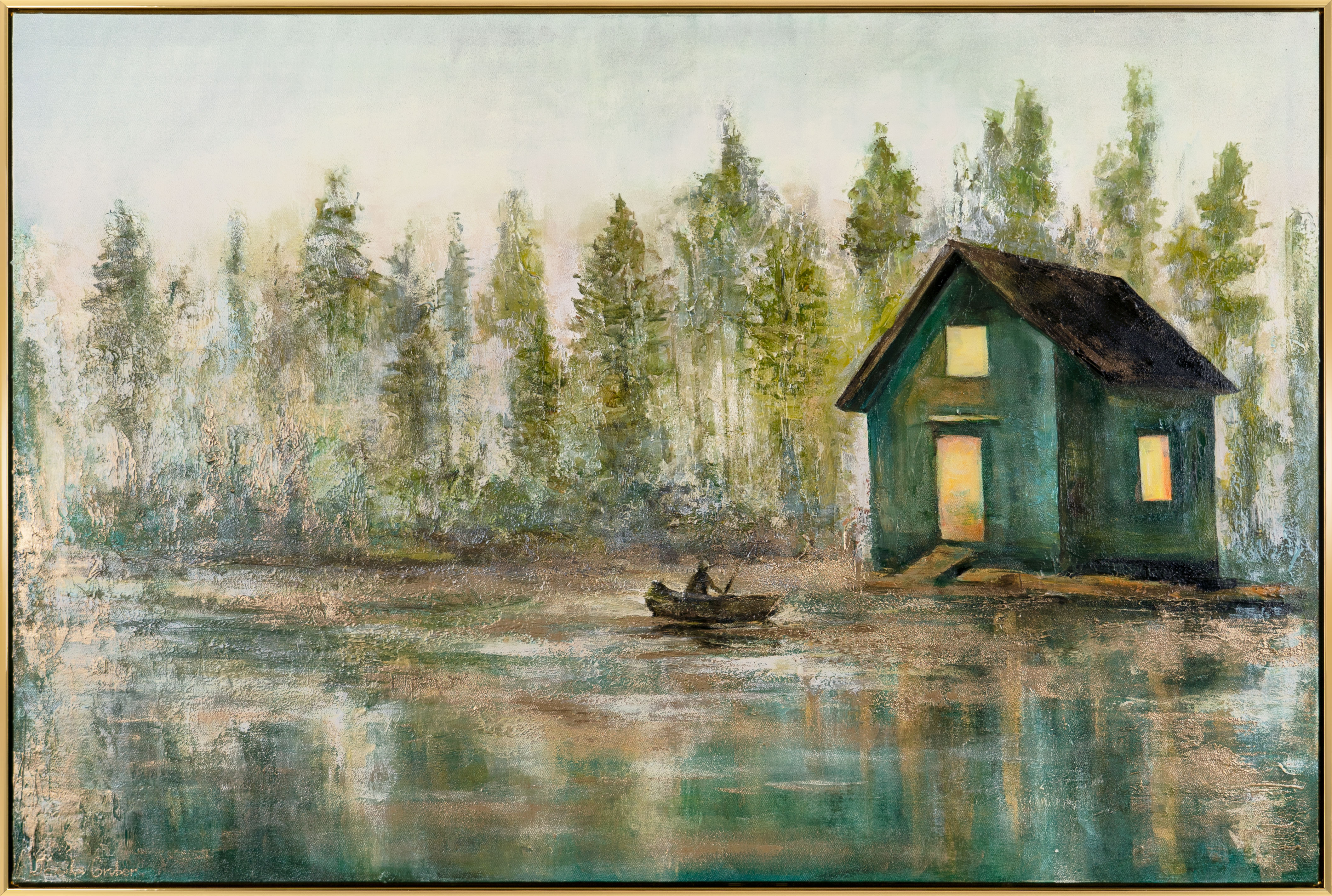 Dawn over a forest lake: through the fog, soft light from the windows of a lonely house standing by the water breaks through. Two people in a boat float on a smooth, mirror-like stretch of water. Everything around is filled with silence and tranquility - the colors are muted, with a predominance of mint, pine needles and smoky shades.