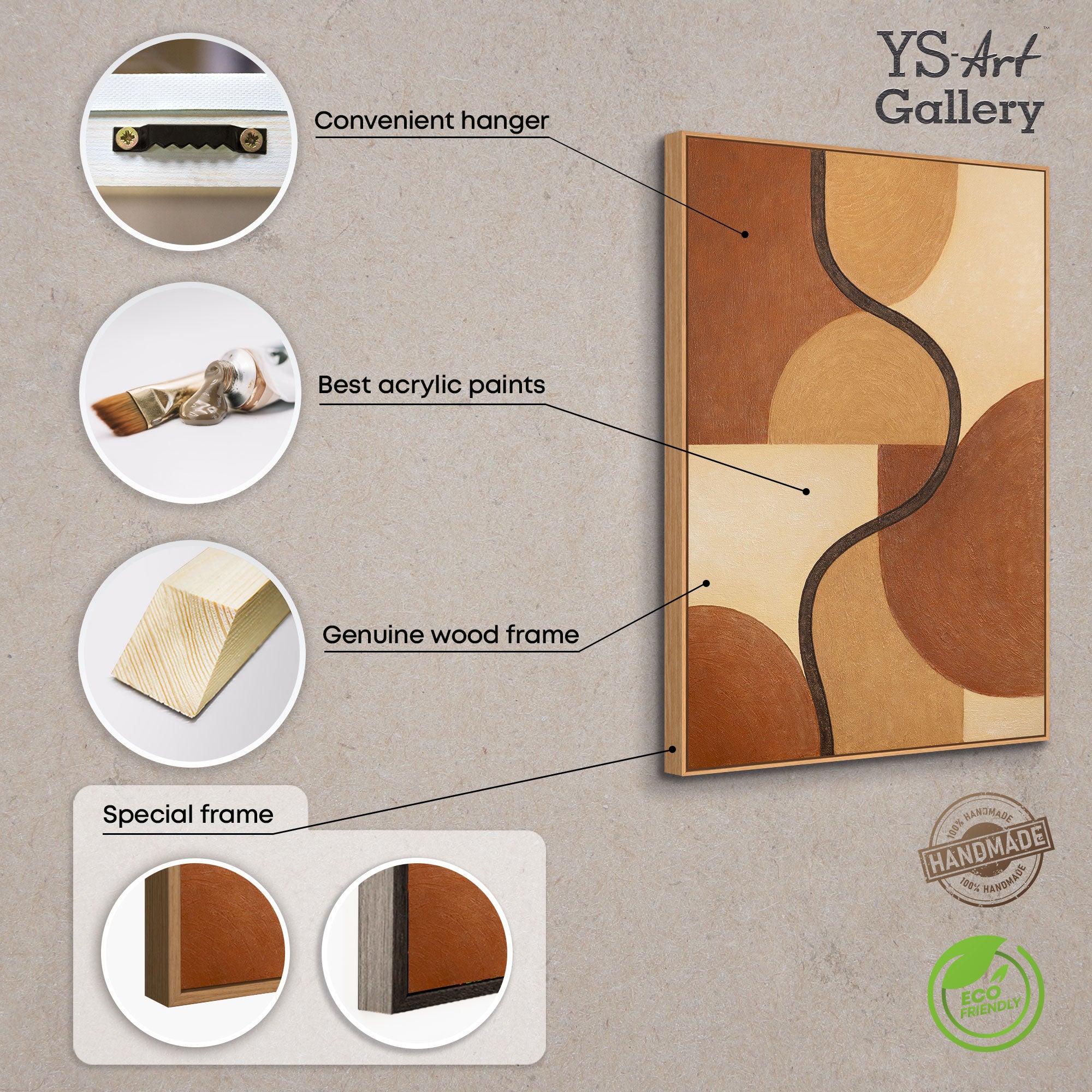 “Intertwining Forms” is an elegant interplay of lines and geometric shapes in a harmonious palette of ochre, brown, and beige tones. The central wavy line adds dynamism to the composition, creating a visual rhythm and a sense of natural movement. The painting combines calm and energy in a balance of color and form.