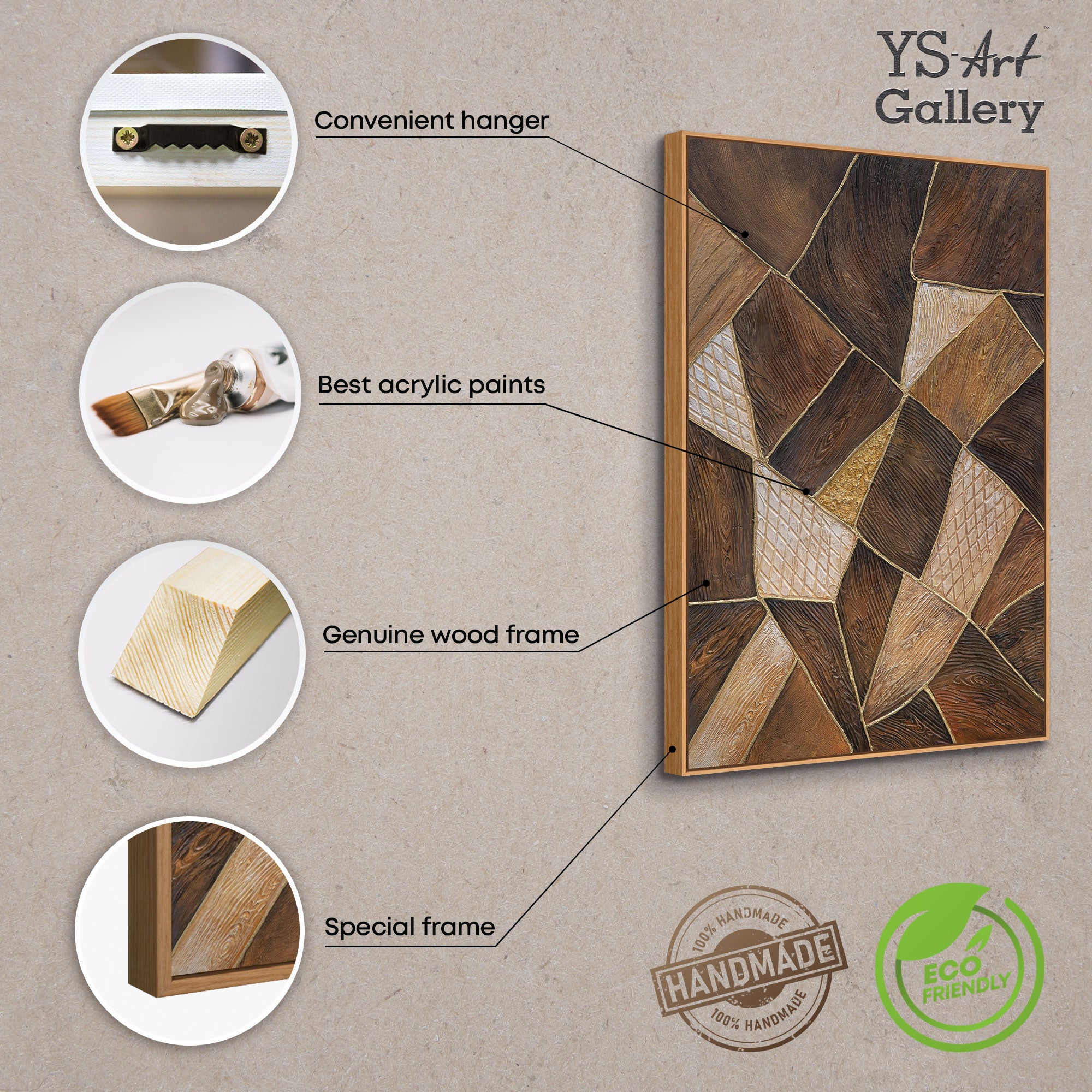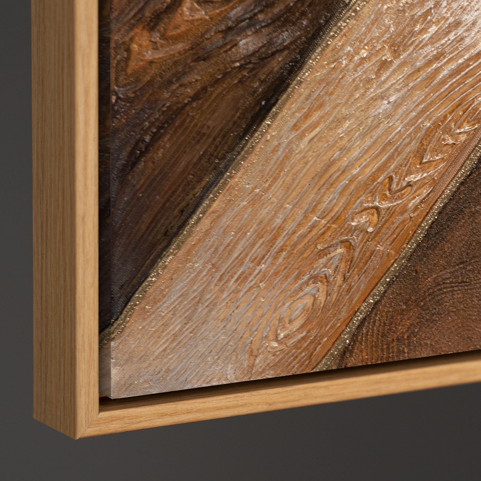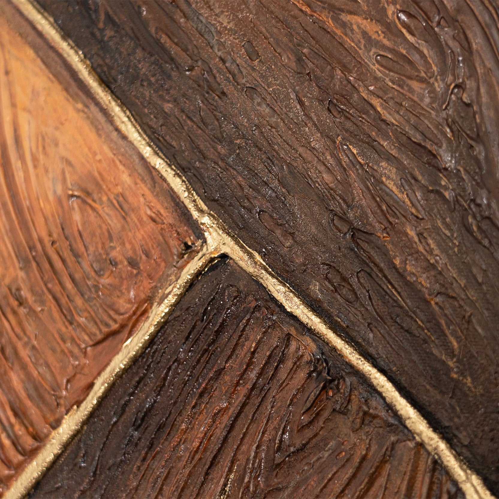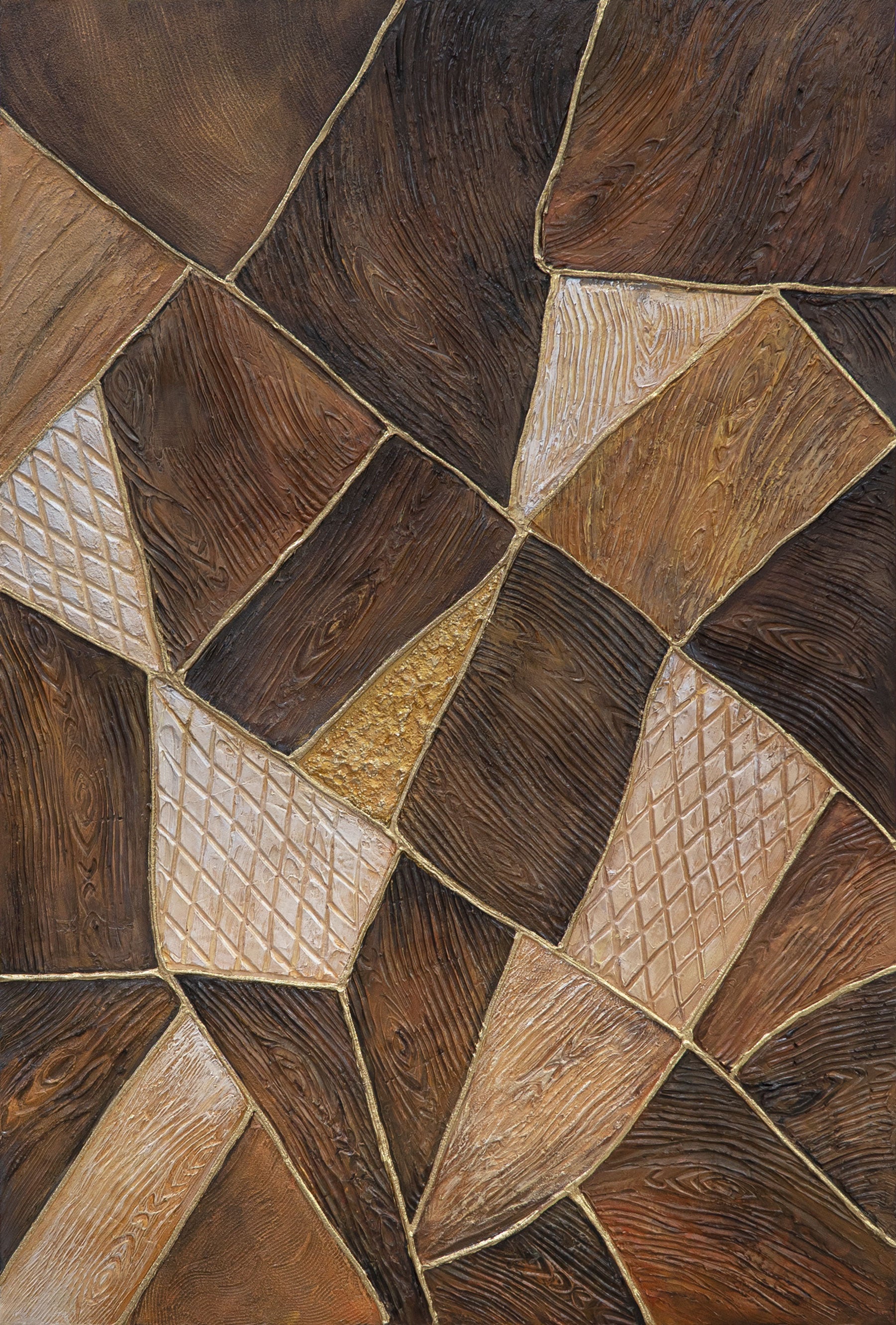 “Geometry of Gold” is a combination of natural wood texture, deep brown tones, and noble golden shine. The painting is created using an expressive relief technique, where each segment forms its own textured plane. Warm tones and a complex surface structure give the canvas the effect of natural material — like fragments of earth joined together in a harmonious pattern.