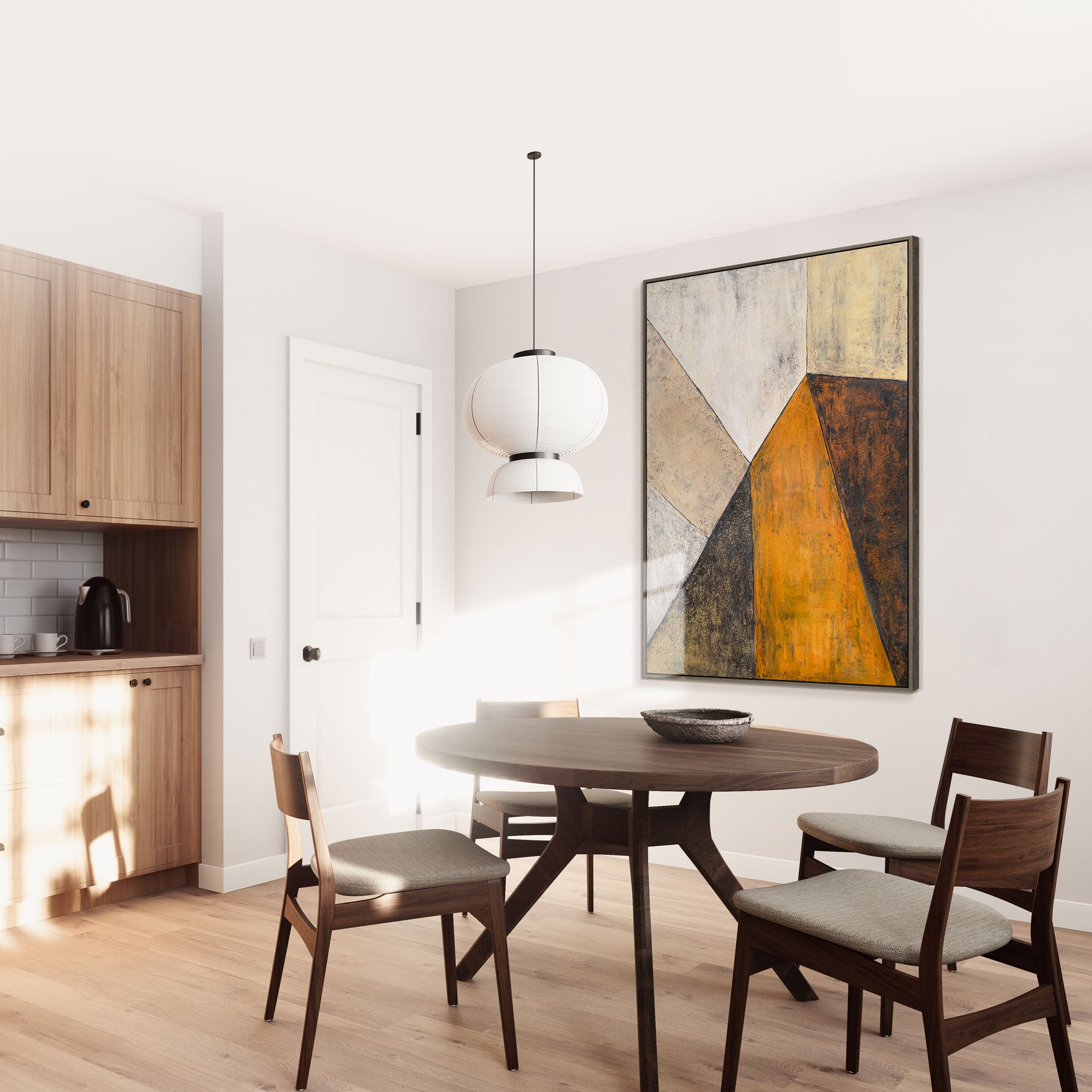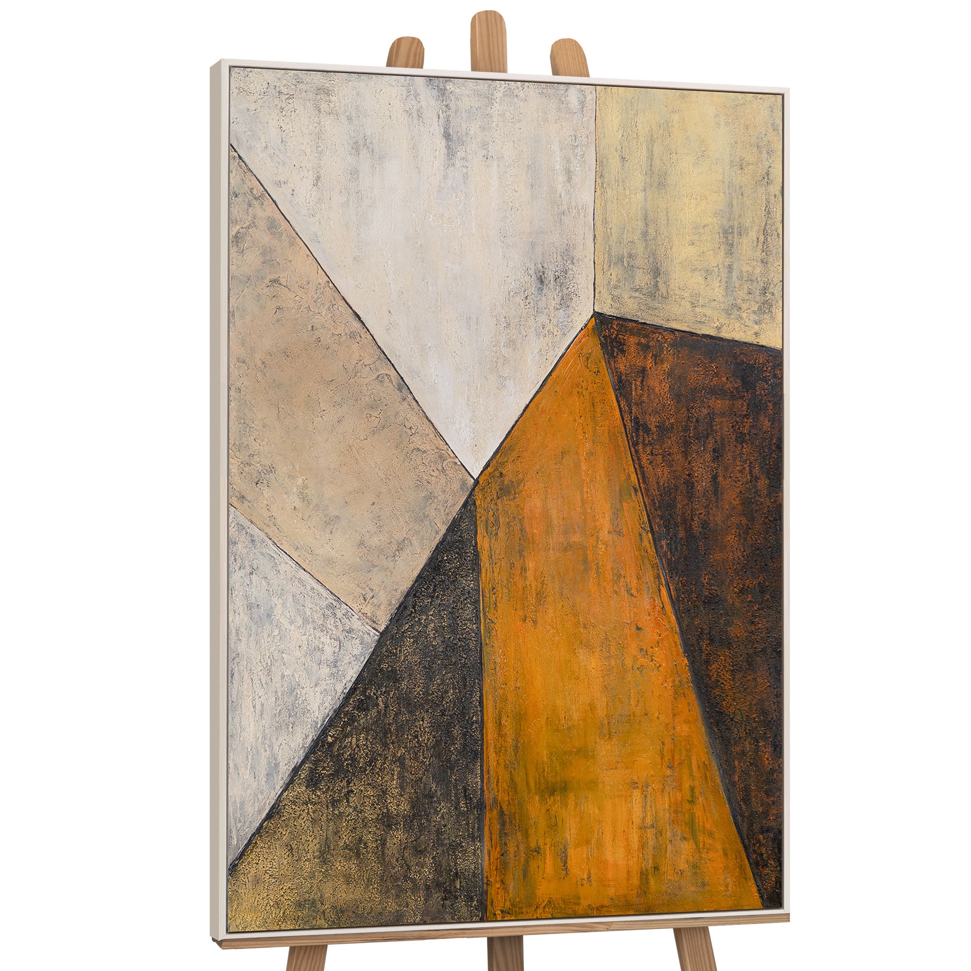 “Meeting of Planes” is a dialogue of colors and shapes, where soft beige, black, and rich orange planes intersect, creating a sense of architectural depth. The textured surface adds materiality to the work, and the contrast of light and shadow creates a dynamic composition that attracts the eye.
