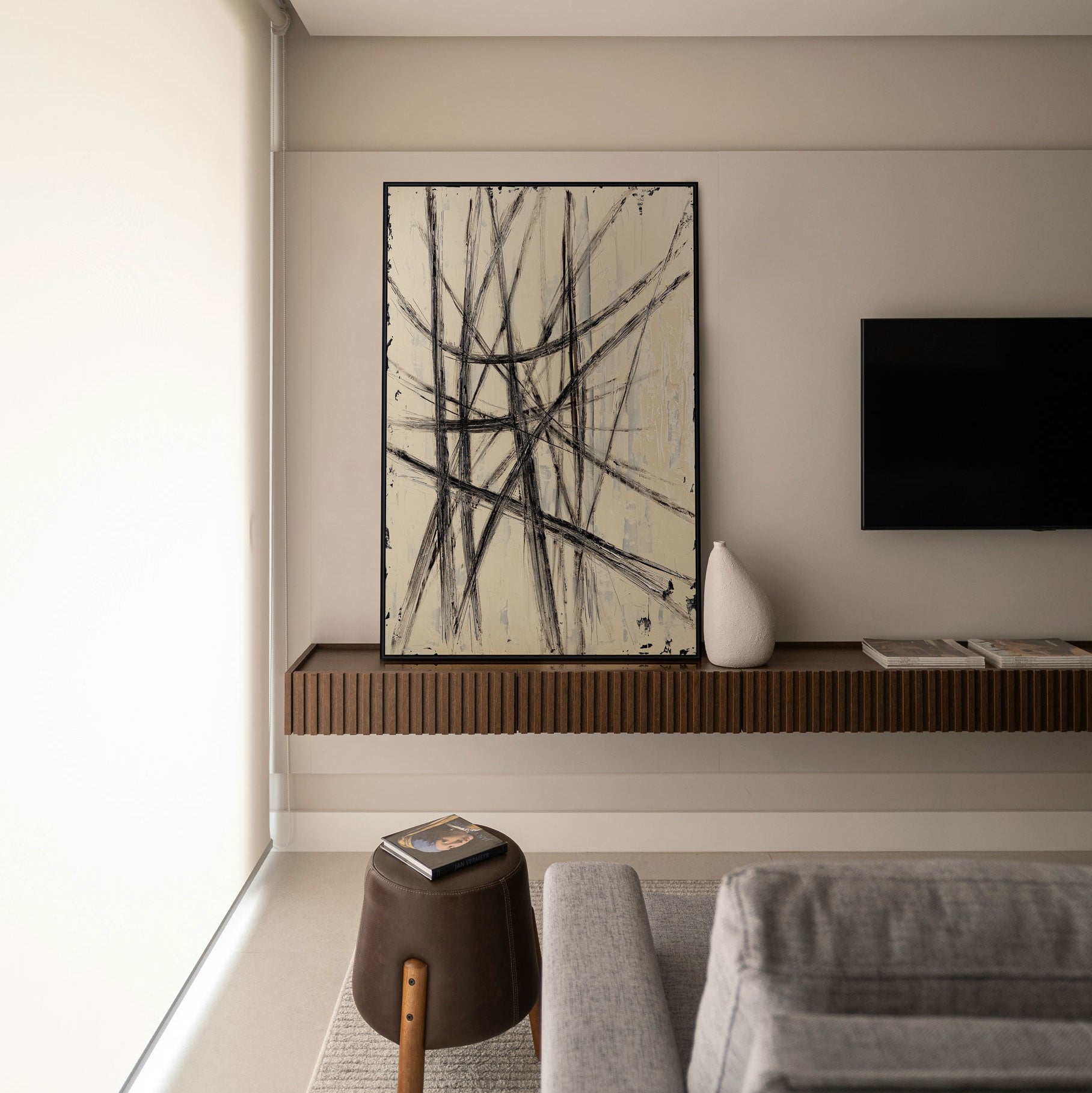 Parallels and Intersections is a play of tension and harmony embodied in black and white lines. The painting conveys the movement and structure that arise in chaos, reminiscent of the architectural rhythms of a metropolis or a network of human connections. The complexity of the composition contrasts with its minimalist palette, creating an impression of strength and precision.