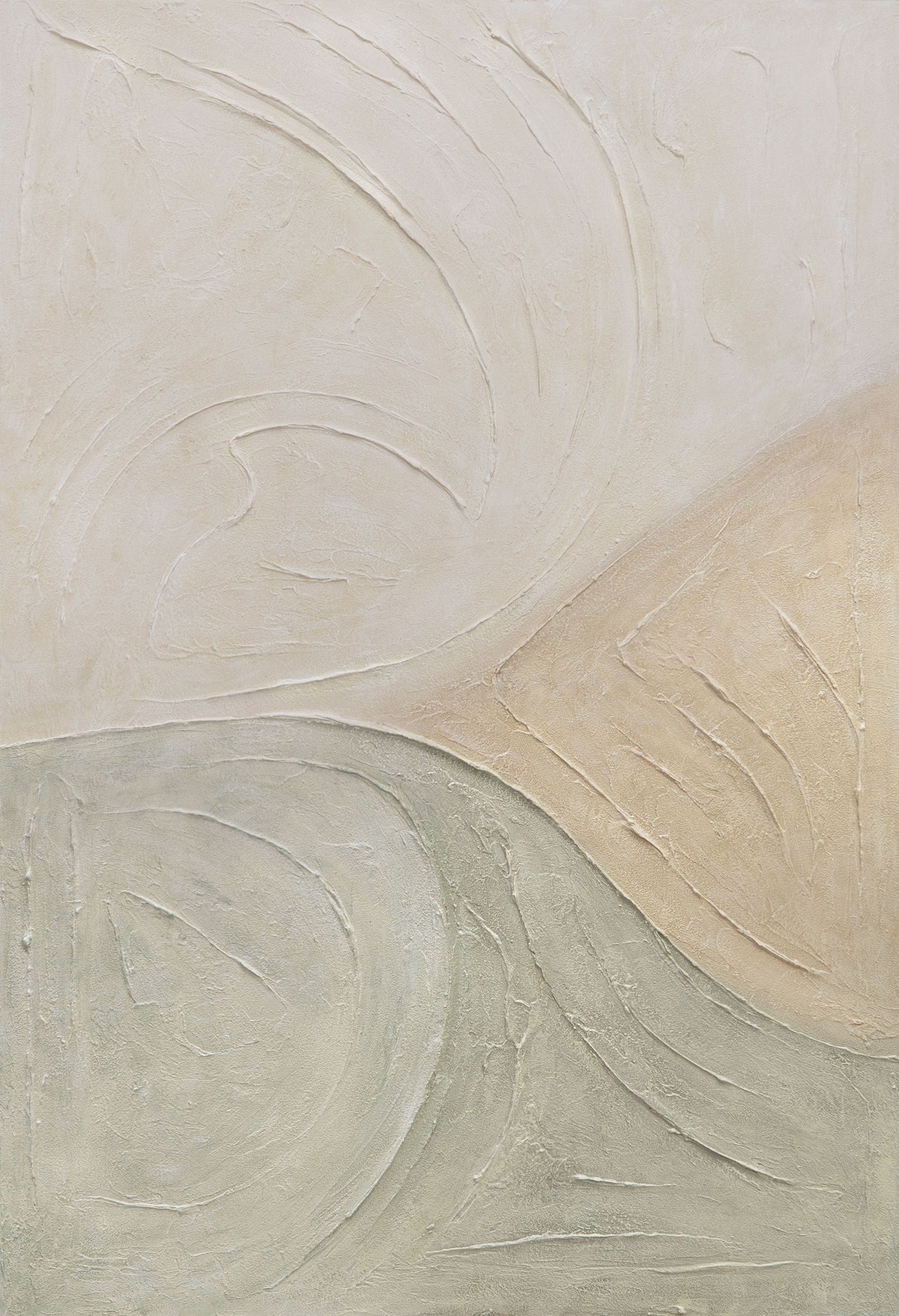 “Rain Trail” is a poetic reproduction of the natural movement of water and wind on canvas. Soft cream, sandy, and greenish shades form a gentle wave reminiscent of the calm after a summer rain. The embossed surface creates a feeling of a living touch of nature, as if the water had just passed, leaving a warm trace.