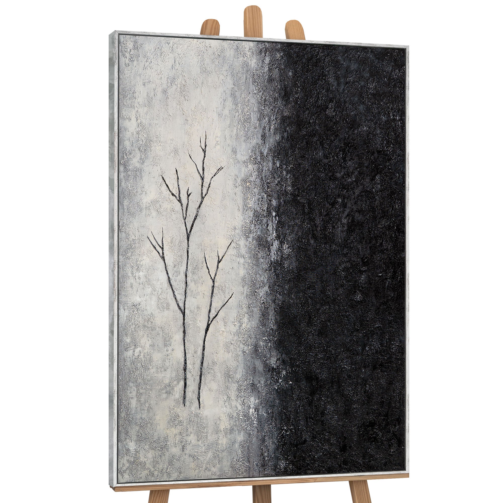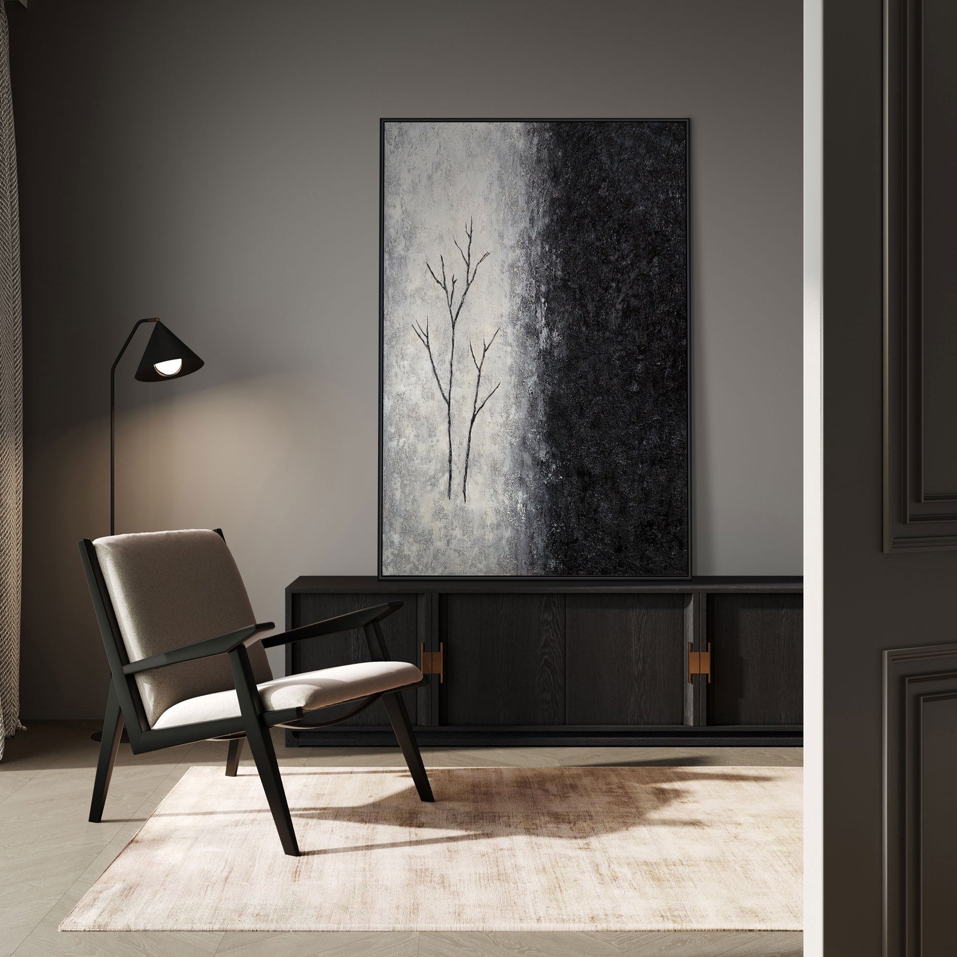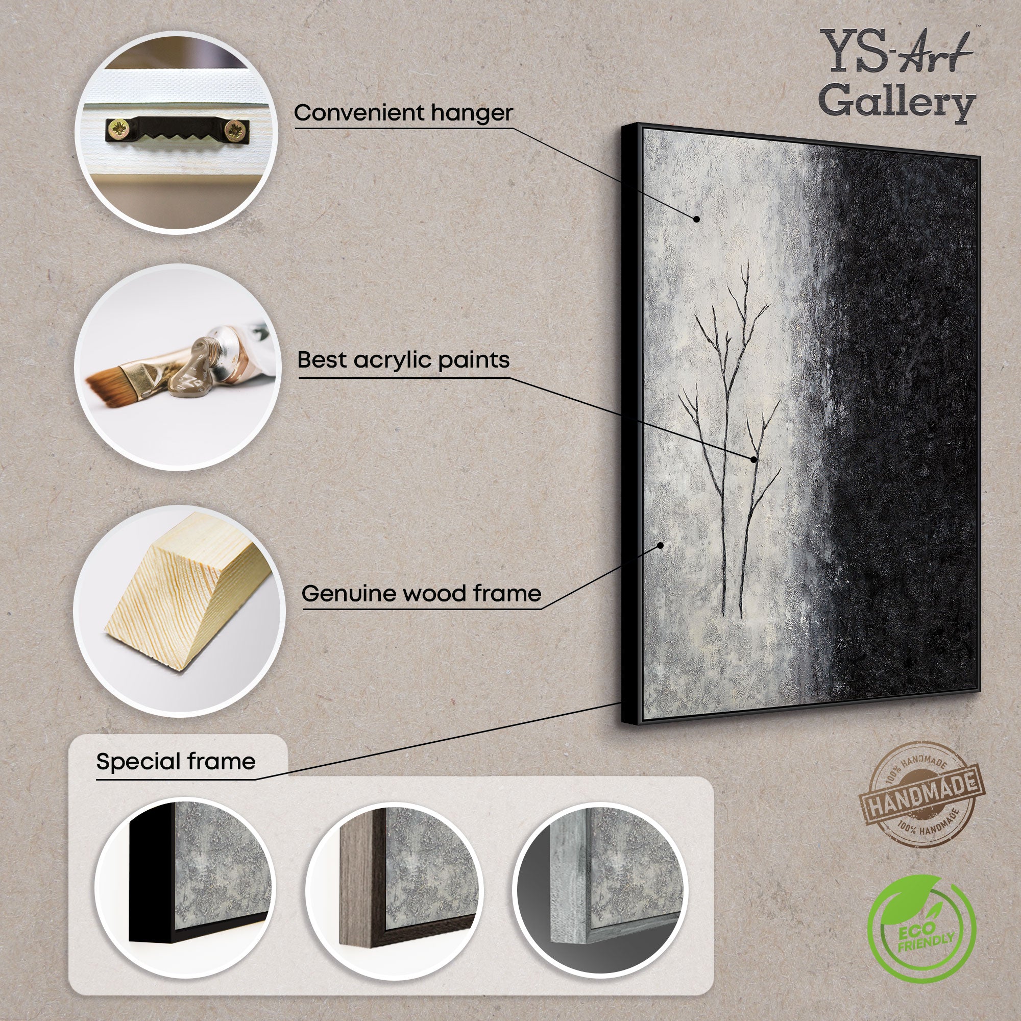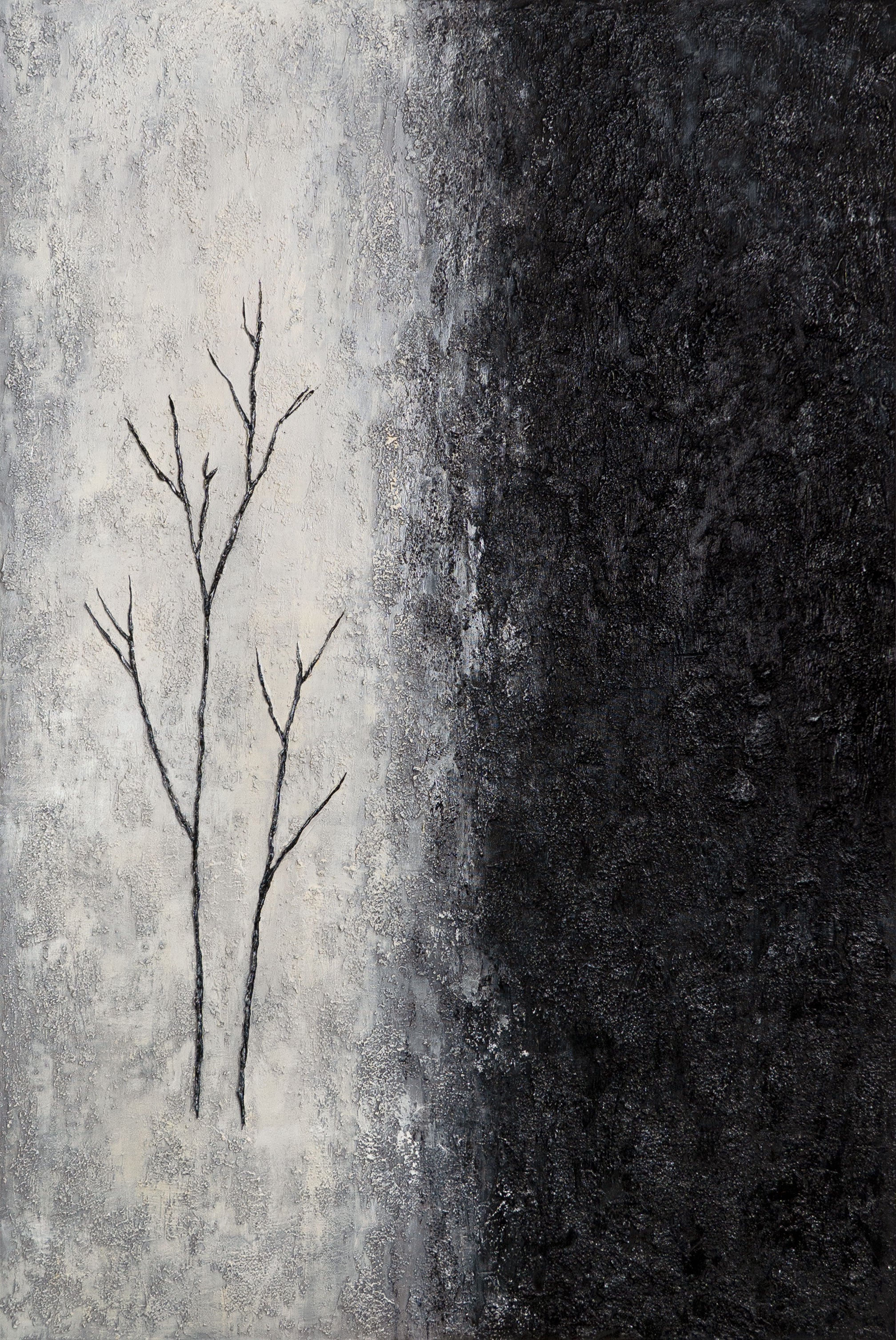 This painting embodies the atmosphere of winter tranquility and contrast. Against a light background, a lone tree is depicted, its thin branches seemingly frozen in the cold air. The contrasting black part of the canvas emphasizes the depth of the composition, creating a sense of transition from light to darkness, from silence to mystery.