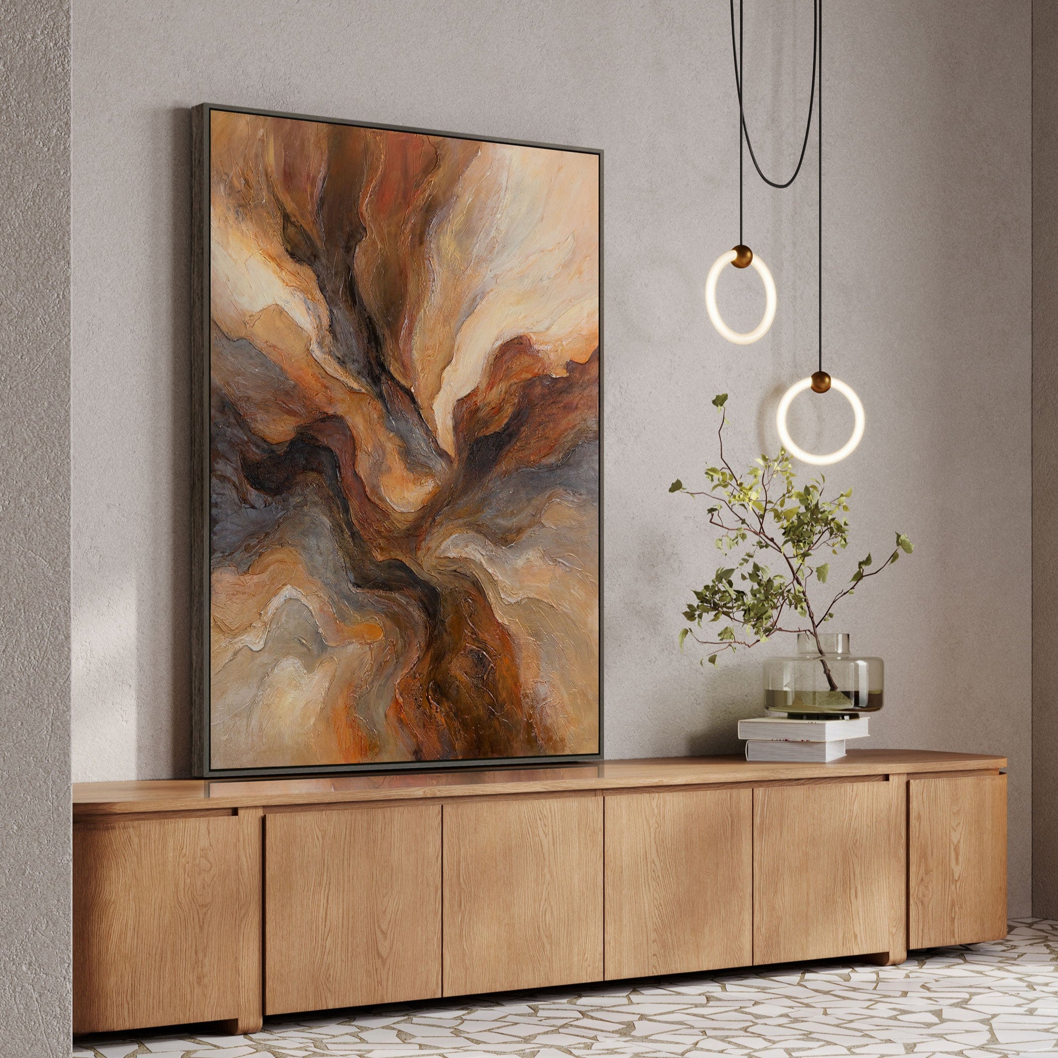 This painting will be a bright accent in a modern interior, adding energy and character to the space. “Flash of Eternity” will emphasize the individuality of the room, creating an atmosphere of strength, warmth, and dynamism.