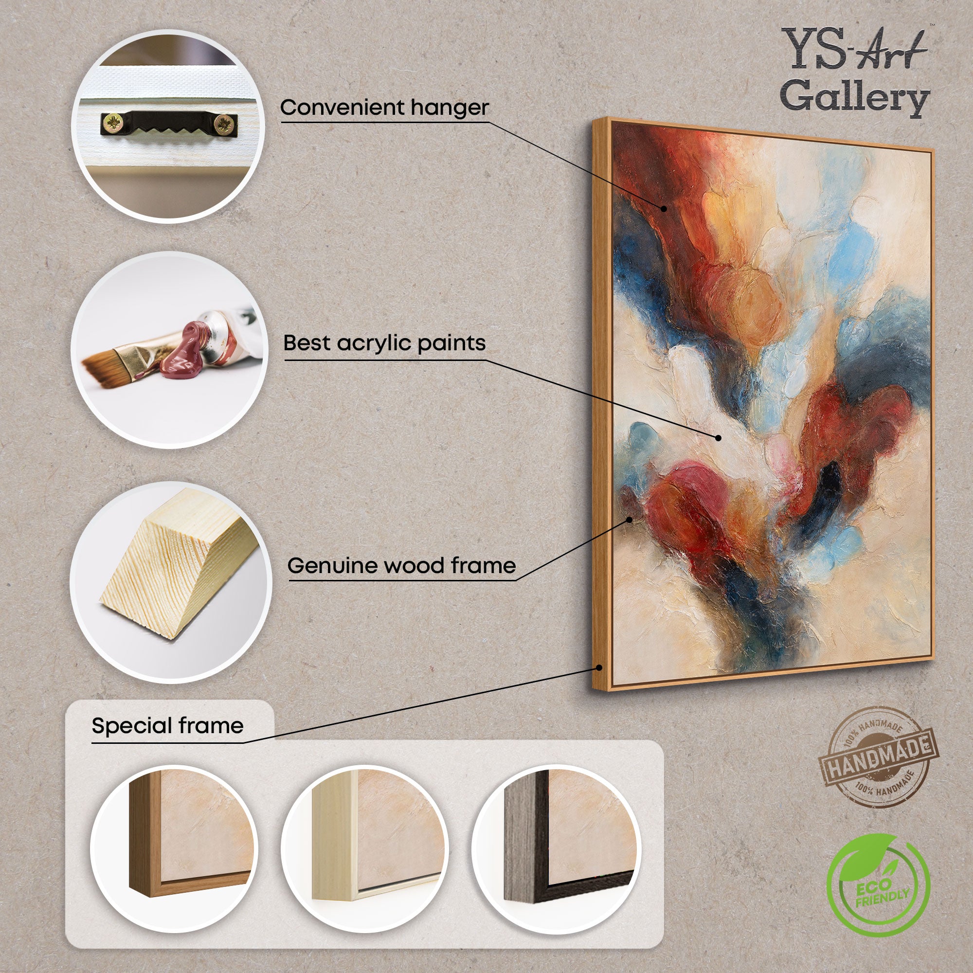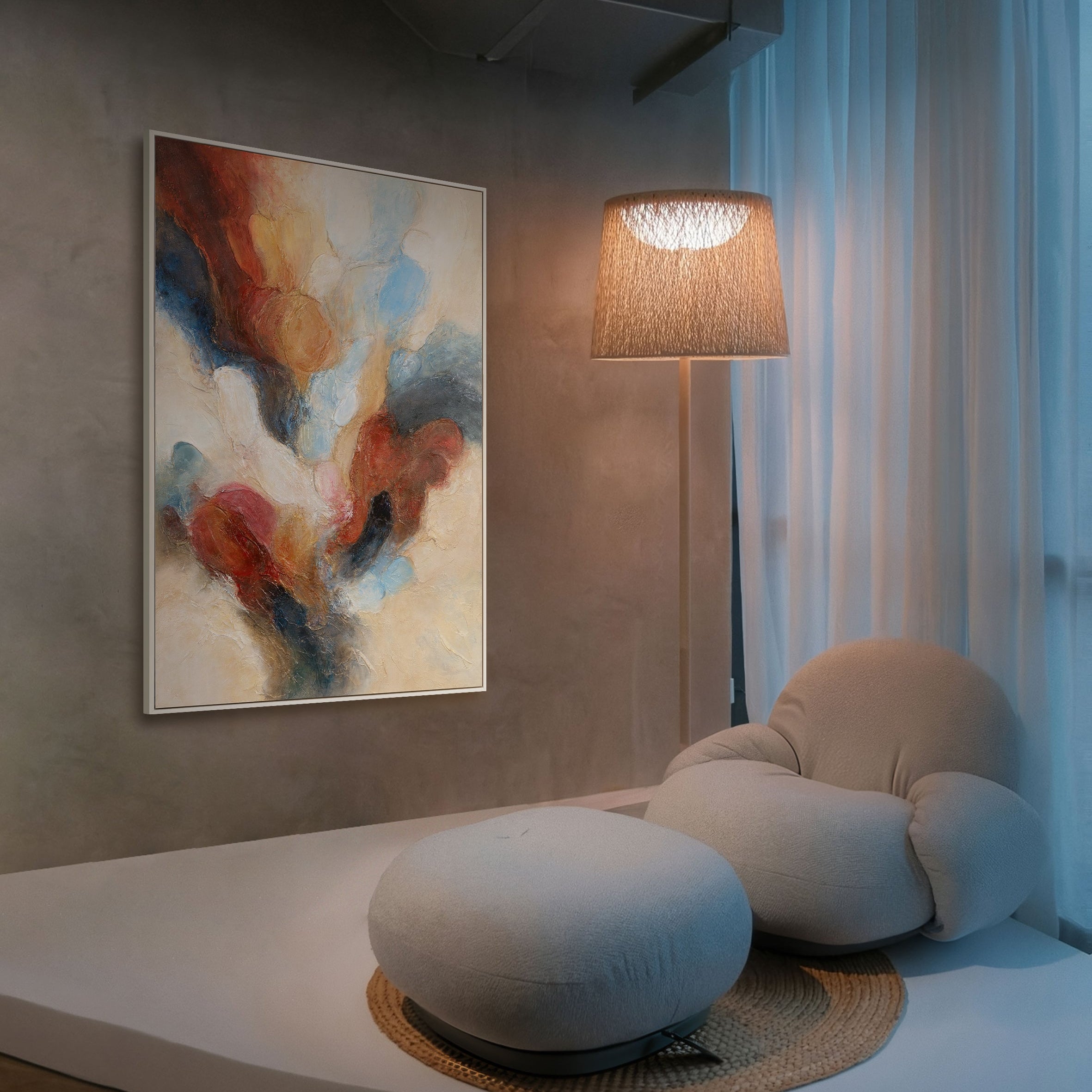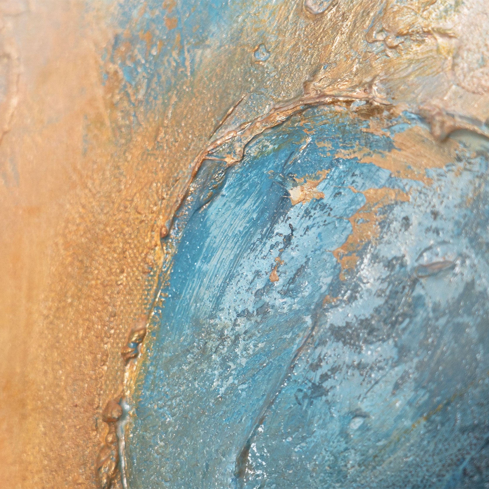 “Music in Color” is an abstract composition where red, blue, and golden hues intertwine in expressive movement, creating the impression of an explosion of energy and a harmonious play of colors. Warm and cool tones meet in a dynamic rhythm reminiscent of live music improvisation on canvas. The textured surface emphasizes the power of the brushstrokes and adds a special depth and expressiveness to the painting.