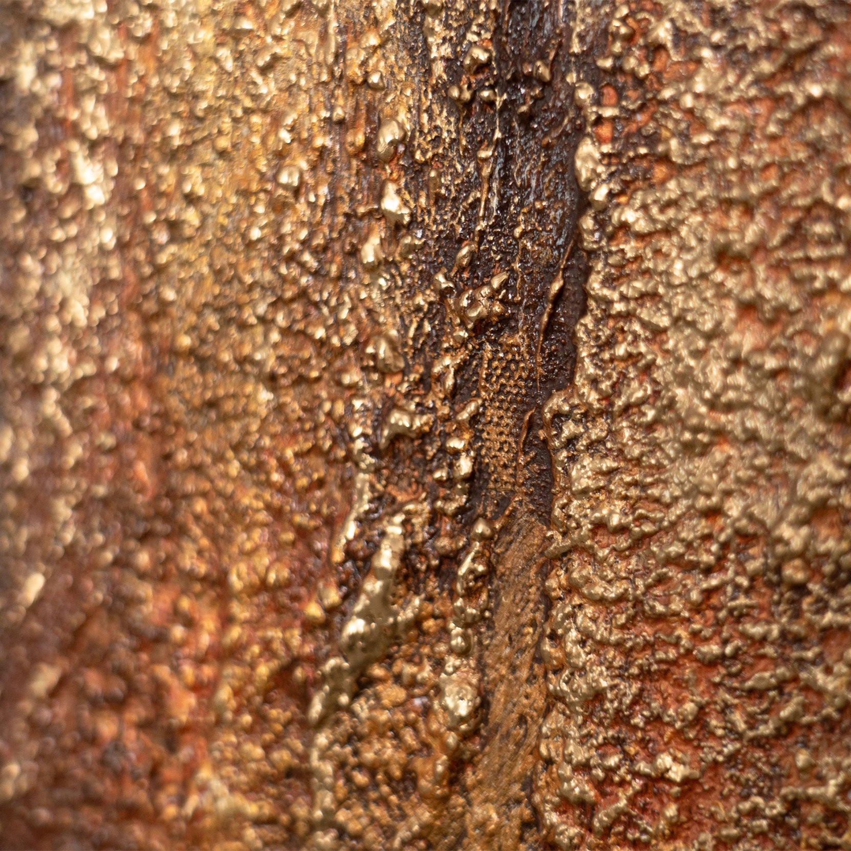 This painting depicts the power and relentlessness of the passage of time. Vertical lines in golden, ochre, and terracotta shades create the impression of streams of light rising from the depths. Dark accents add depth and drama to the composition, while the relief texture enhances the sense of movement.