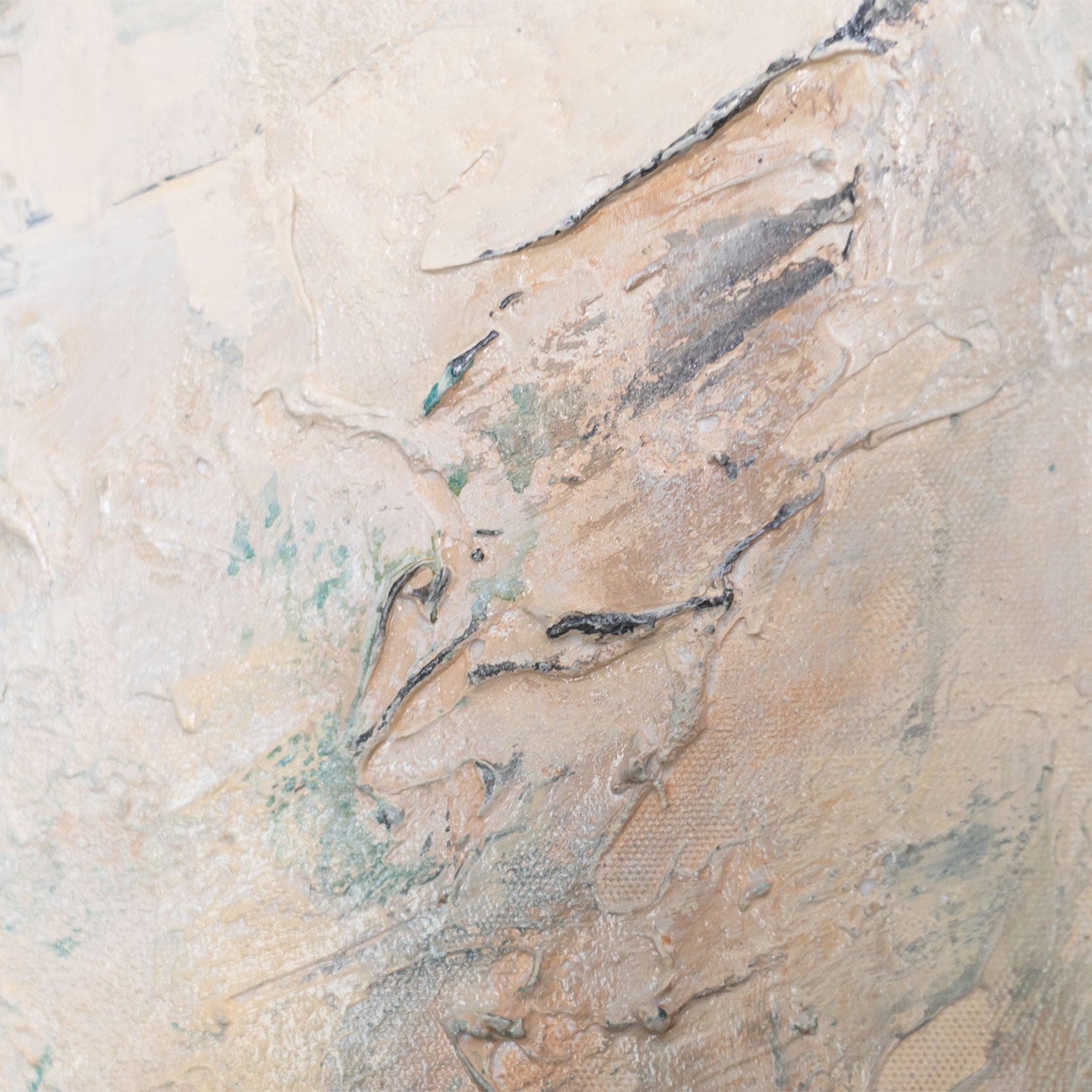 “Warm Whisper” is an abstract painting where light shades of white and blue create a feeling of airiness and space. A light touch of warm orange-red adds a distinctive accent to the work, contrasting with the cool tones and enlivening the composition. The textured surface emphasizes the smoothness of the transitions and makes the painting more profound and vivid.