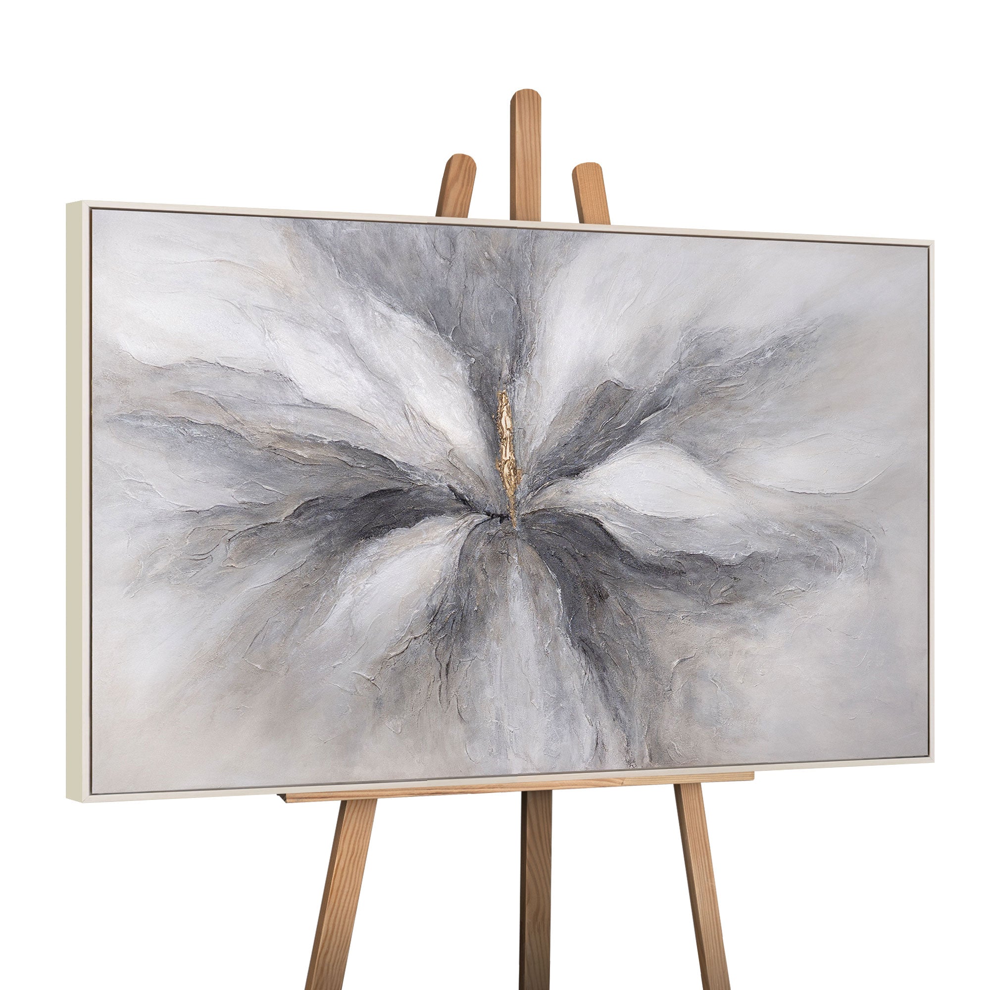 This painting radiates restrained power and elegance. Dynamic strokes in shades of gray, white, and silver merge into a single composition, creating a sense of explosive energy. The central golden stroke emphasizes the depth of the canvas, adding a refined glow and accent.